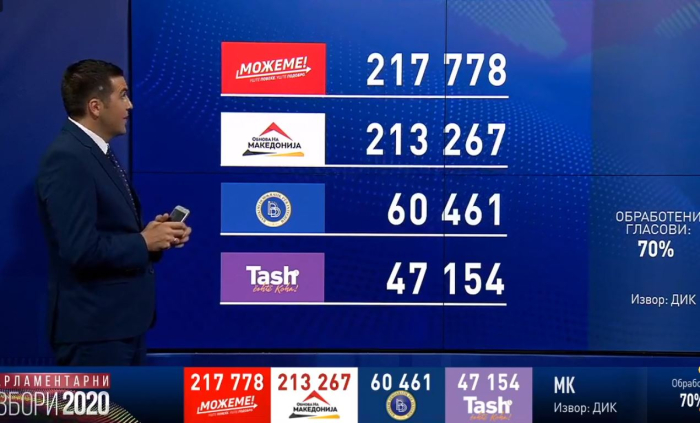 Од обработени 70% од гласовите СДСМ има предност од околу 4500 гласови преднсот пред ВМРО-ДПМНЕ односно, 217.778, ВМРО-ДПМНЕ има 213.267, ДУИ има 60.461 и Алијанса има 47.154.